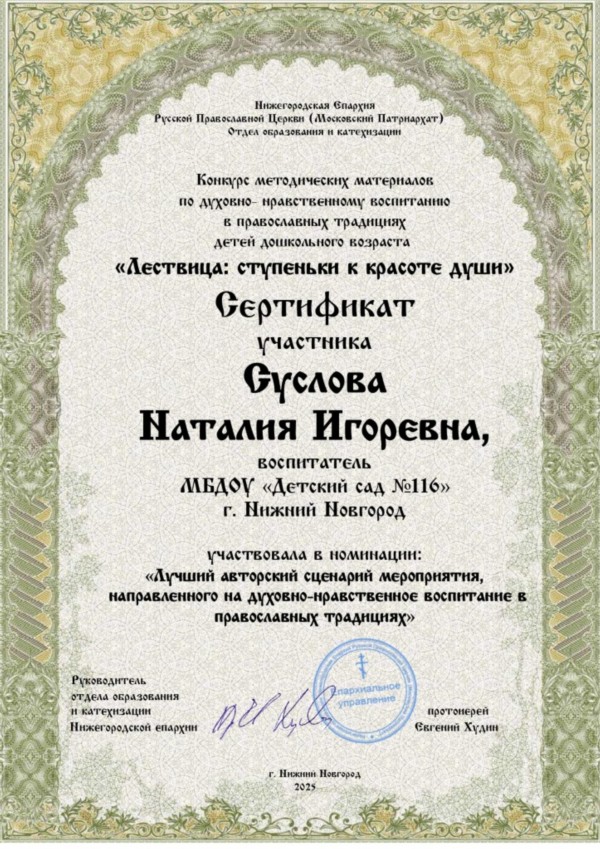 Поздравляем воспитателя подготовительной группы № 9 - Суслову Наталию Игоревну с получением наградных документов за участие в VII Международном конкурсе "Расскажи миру о своей Родине". Она подготовила вместе со своими воспитанниками замечательный видео - ролик о своем родном городе Нижнем Новгороде.