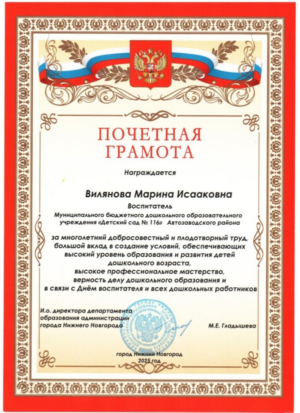 Почетными грамотами Департамента образования г. Нижнего Новгорода награждены педагоги нашего дошкольного учреждения: Вадеева Анастасия Алексеевна и Ананичева Наталья Геннадьевна!