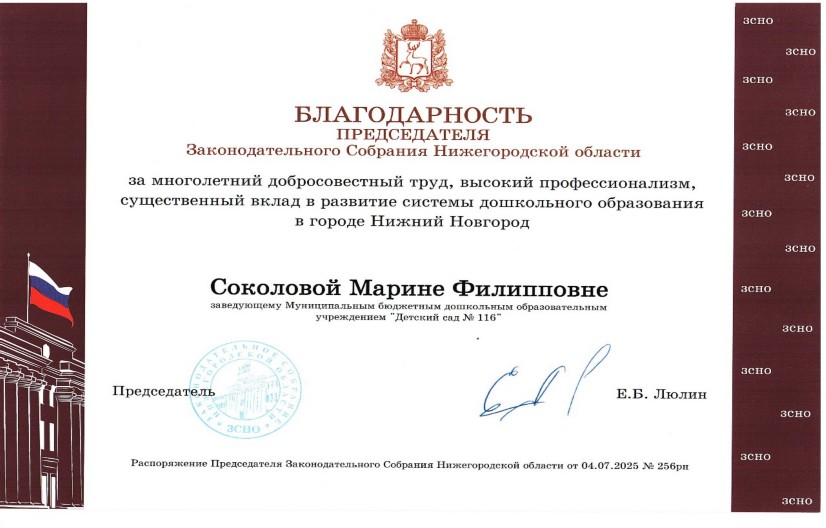Благодарностью Председателя Законодательного собрания Нижегородской области - Люлина Е.Б. за многолетний допросовестный труд, высокий профессионализм, существенный вклад в развитие системы дошкольного образования в г. Нижний Новгород.