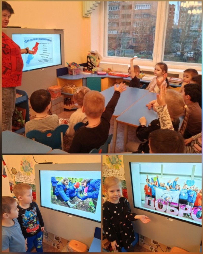 В средней группе прошел День добровольца (волонтера) в России. Вместе с девочкой Мариной и роботом Яшей ребята узнали, что волонтеры - добровольные помощники делают добрые дела не ради денег. Посмотрели и обсудили мультфильм "Просто так", где герои совершают хорошие поступки, чтобы увидеть улыбки других и услышать в ответ "Спасибо". А также получили видеописьмо от сказочных человечков: Тихони. Елочки, Шалуна и Умницы - защитников природы с просьбой о помощи.У них в лесу невоспитанные люди раскидали очень много различного мусора. ребята с радостью помогли навести порядок на лесной полянке, разобрав мусор по контейнерам. А в конце занятия определили, кто нуждается в помощи и поделились с ними "капелькой счастья"!