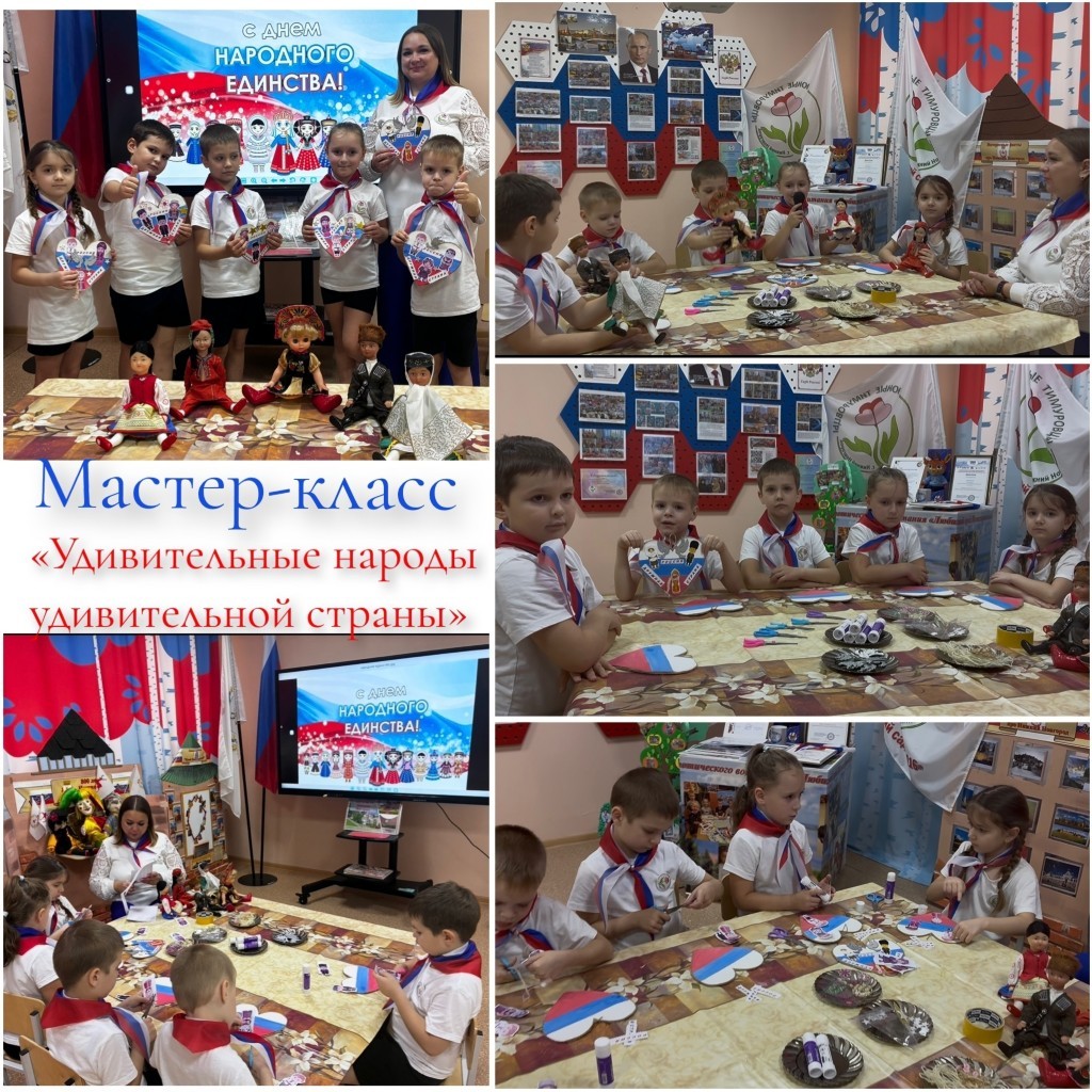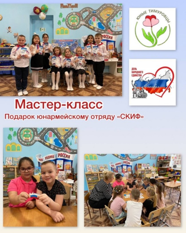 В преддверии праздника Дня Народного единства юные Тимуровцы подготовительной группы N 8 участвовали в тематическом мастер-классе. День народного единства это праздник патриотизма, взаимопомощи и единения всех народов России. Дети познакомились с историей возникновения праздника. О том, как важно жить дружно и мирно в такой многонациональной стране как Россия. В конце занятия у детей получилась своя уникальная открытка, на цветовой фоне флага России с элементами народов России.